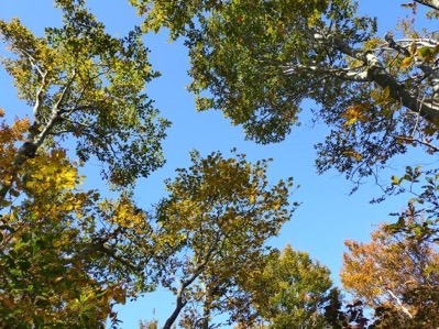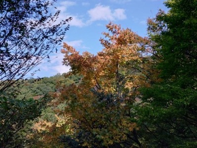 青空に飛行機が飛んでいます。近くの木の枝には小鳥がとまりチチチチロロロとさえずっています。準備体操を済ませ、完成しそうな茅葺き作業の様子を見ながらふるさと館の後ろを通り山に入りました。13名の参加、9時25分の出発です。