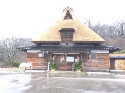 工事の足場が撤去され、真新しい茅葺き屋根になったふるさと館が朝日に照らされています。