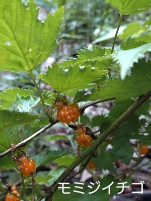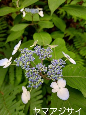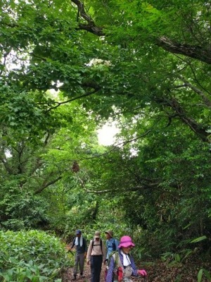 大休場に到着。それぞれ、携帯椅子での休憩スタイルが増えてくつろいでいます。次はどこへ? 北辰広場からあざみの道に決定。林道分岐辺りに木苺(モミジイチゴ)の熟したのを見つけ、頬張ると甘く美味しいデザートになりました。北辰広場への道沿いに、山紫陽花がたくさん咲いて季節を彩っています。テイカカズラ、イワガラミもまだ健在でした。北辰広場は見事に草ぼうぼうの状態、あざみの道を通り帰路に着きました。