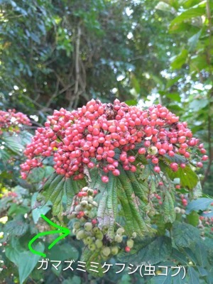 林道出合のガマズミの実が真っ赤になっていますが……緑の玉が混じっています。何?家に帰って調べるとガマズミミケフシタマバエによる虫コブでした。