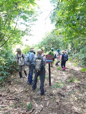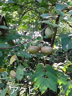 北辰広場手前にTさんがハタケシメジの赤ちゃんを発見。来週大きくなっているでしょうか。北辰広場のミゾソバ、ツリフネソウ群生はまだまだ綺麗です。まだ10:30なので、久しぶりに法師山に登る事にしました。下草が刈られていて山頂広場は広々しています。残念ながら雲に隠れて立山連峰は見えませんでしたが、アケビがいくつも成っているのを確認しました。