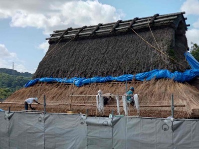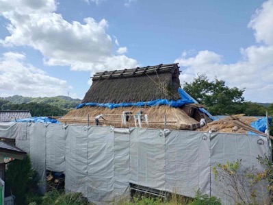 帰りはアザミの道から戻ります。サルトリイバラの実が少し赤く色付いています。11:50下山。ふるさと館の茅葺き屋根の工事を見学して解散しました。約9500歩の散策でした。