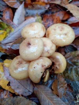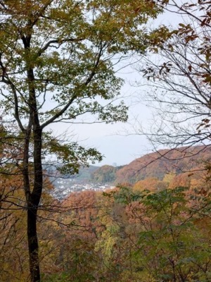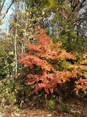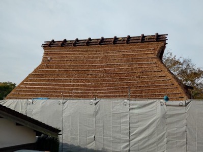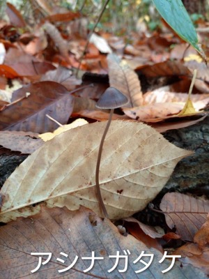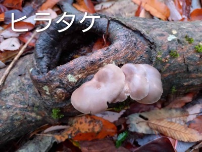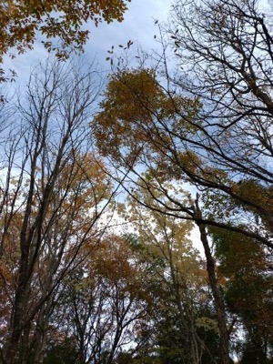 ラジオ体操の後最終段階に入った茅葺き屋根を眺めながら1時間程の散策へ出発します。海の見える丘では、今日海は見えませんが、周辺の山の紅葉が綺麗です。コナラの広場からやすらぎの広場へと進むとちっちゃなヒラタケが生えていて、ナメコも少し出ていました。サクラの広場では落葉が進み枝だけになった木、紅葉、黄葉が空を見上げると青空に映えていました。来た道を戻り10:30ふるさと館に到着約5000歩の散策です。