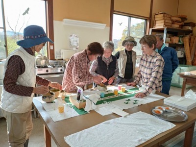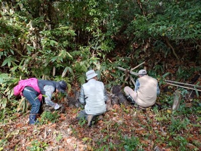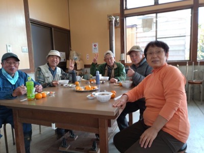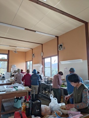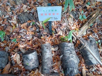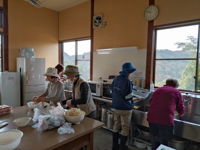 体験工房で芋煮を準備する人とナメコのほだ木整備をする人に分かれて活動します。ナメコのほだ木には再度カワラタケが生えていて、鎌で除去します。ナメコはもうダメかねと話していたら、菌打ちした場所からちっちゃなナメコが生えていて大喜びです。来年に期待が持てそうです。