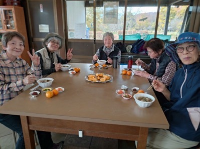 手分けして皮をむいてきた芋の子、WさんTさんが処理して下さったマイタケとヌメリスギタケ。2キロの牛肉、人参、牛蒡、コンニャク、エノキ、シメジ、シイタケ、M下さん畑の下仁田ネギの入った具沢山芋煮が完成しました。皆で食べる芋煮は最高です。味変のカレーうどんも美味しいです。差し入れの栗の渋皮煮、干し柿、甘柿、みかん、漬け物、お抹茶に主菓子は『錦秋』です。どれもとても美味しく幸せな時間でお腹はポンポンです。後片付けもサクサク終わり無事芋煮会終了と成りました。
