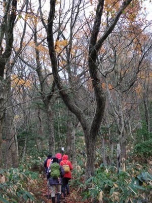 ふるさと館の屋根の葺き替えは終わり回りの足場だけ残っていました。真新しい屋根に薄っすらと新雪が纏っていました。今日は大休場まで行く事にしました。昨夜の嵐で山の木々は殆ど丸坊主になり、木立だけで見通しよくなり、もう熊は冬眠してくれたかな。