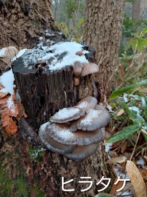 海の見える丘は県庁さえ見えず、地面は濡れ落ち葉。一応ナメコの出そうな所を回り大休場に到着。山並みは一切見えず、葉っぱを落とした柿の実だけが色を添えてくれてます。雪がちらつくので、ゆっくり休憩する気になれず帰路に着きました。少し歩くと切り株のところに立派な平茸発見! 行く時は気づかなかったのが不思議な程です。