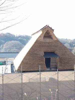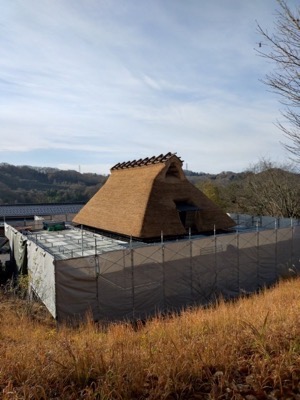 園長さんから白山展望場と法師山の眺望改善に伐採を実施したと聞き、ワクワクして法師山を目指す事に決定! 先ずは今週末に足場撤収予定で、漆喰補修中のふるさと館の茅葺き屋根(材料は富士山麓と阿蘇山麓のススキ)を眺めて出発します。