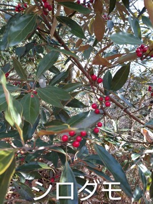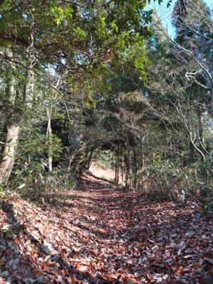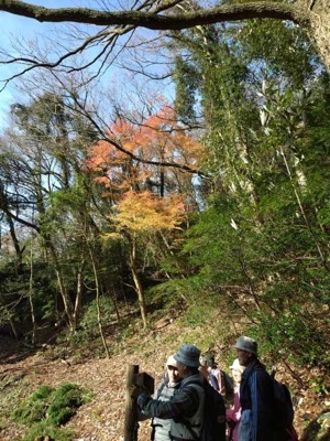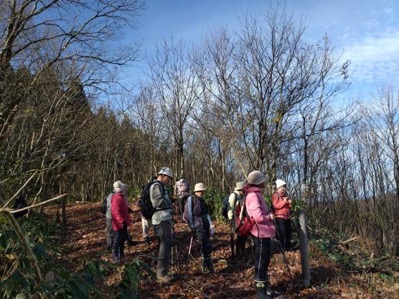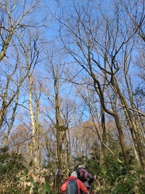 シロダモの赤い実が目に付きます。葉は樟脳の匂いがするそうです。海の見える丘からは青い海がハッキリと見え、O野さんからドングリに関するお話しを聞きました。白山展望場所へ近づくと、いつもは暗く見える道に光が当たり輝いて見えます。何本も杉が伐採されて白山がハッキリ見え、素晴らしい!と歓声が溢れ、次の法師山への期待が増します。大休場に到着暫し休憩。こちらは白山に大長山も見えます。